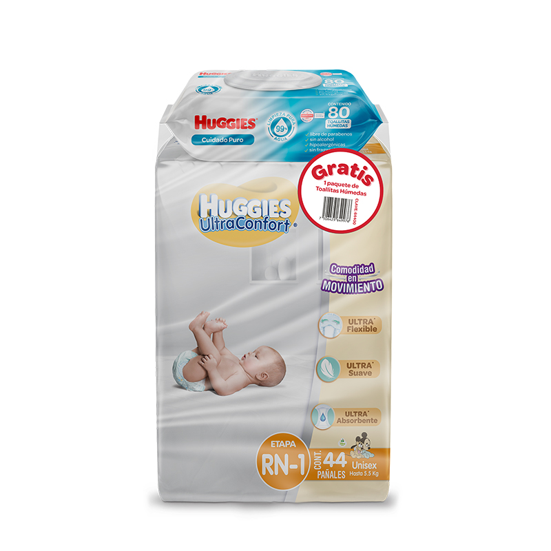 HUGGIES ULTRA CONFORT ETAPA RN-A UNISEX C/44 PANALES+CUIDADO PURO C/80 TOALLITAS HUMEDAS